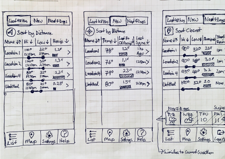 We efficiently generated user flow diagrams on paper and subsequently submitted them to the client and farmers for immediate feedback. The primary screens that we emphasized were the screen that tracks each Arable device's information and allows farmers to easily view the necessary device information on a mobile device.